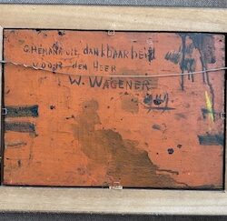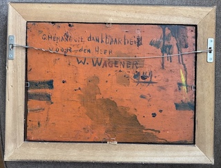Uit de achterzijde blijkt dat Héman dit werk in 1949 speciaal voor W. Wagener maakte. W.A.Wagener (1901-1968) was in Rotterdam een bekend schrijver en journalist van het Rotterdamsch Nieuwsblad. Hij schreef o.a.het boek dat in de na-oorlogse jaren in veel Rotterdamse huishoudens aanwezig was: 'Rotterdam Onherroepelijk'(1963). Maar daarvoor had hij in 1942 Héman genoemd in het Rotterdamsch Nieuwsblad. In oktober 1944 opende Wagener een expositie van zes 'Baanbrekers' aan de Provenierssingel, daar exposeerde o.a. Gérard en trad Emmy van der Loos (Hémans latere vrouw) op als pianiste. Hij schreef in 1948 over Hémans werk aan het Rabover-gebouw en het jaar daarop over Hémans Utrechtse solo-expositie.