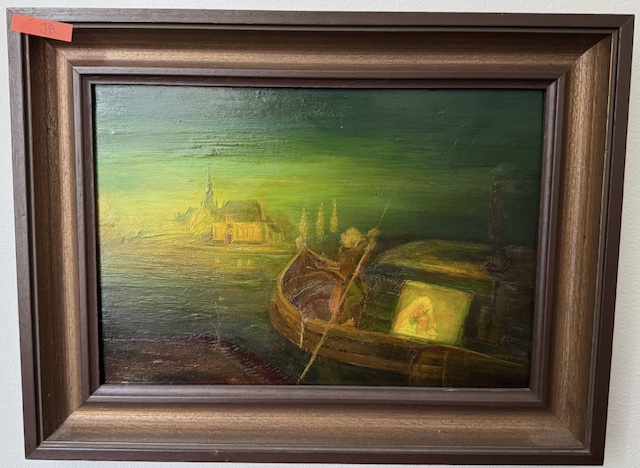 In een boot (veerboot?) vaart Maria en het kind met Jozef op het dek, langs het Veerhuis aan de Schie in Overschie. Op de achtergrond het karakteristieke kerktorentje. Héman beeldde het Veerhuis en Overschie meerdere malen af.
