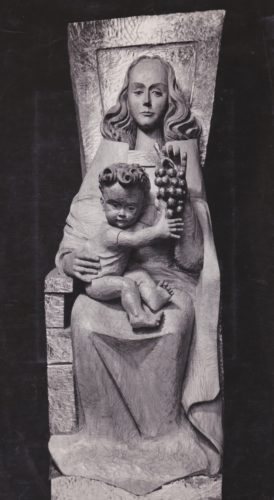 Zittende Maria met op de schouder vallend haar. Zowel Maria als het kind kijken naar voren en zijn en face afgebeeld. Het kind grijpt naar een tros druiven in Maria’s rechterhand. Van de stoel (troon) zijn eenvoudige achter- en linkerleuning zichtbaar. Rechts valt Maria’s met een gesp op borsthoogte gesloten mantel over de leuning.