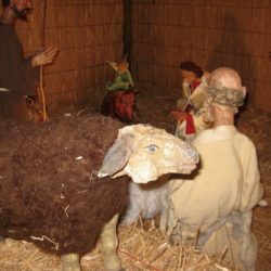 - 'Aangeklede' kerststal. Hoofden en handen van de mensfiguren en schapenkoppen van keramiek.