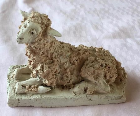 Lammetje foto: T. Ermers-Héman Verwant aan BKO-065 , -114, -116. Catalogusnr.BKO-115Datum1980's wsMediumRood en wit bakkende chamotte.Afmetingen (HxBxD)onbekendCredit lineParticulier bezit, Capelle aan den IJssel.
