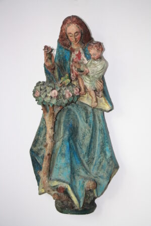 Maria in een blauwe mantel met een roos in haar rechterhand staande naast een rozenboom. Het werk hangt tegen een muur.