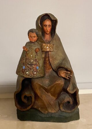 Zittende madonna met Kind. De mantel krult zich links en rechts symmetrisch naar binnen om de benen. Maria draagt het staande Kind op de linkerknie. Het Kind met lang gewaad dat bespikkeld is met glazen steentjes, strekt beide handen naar voren. Maria draagt de mantel over het hoofd, de sluitingsgesp in het midden ook met gekleurde steentjes. De mantel vertoont links en rechts en aan achterzijde duidelijke gutssteken.