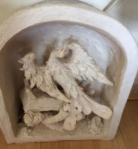 Jongetje, liggend onder omgekeerde tafel of bank. Daarboven een sprookjesvogel met pauwenstaart. Kleine boogvormige nis. Het geheel in witte chamotte.